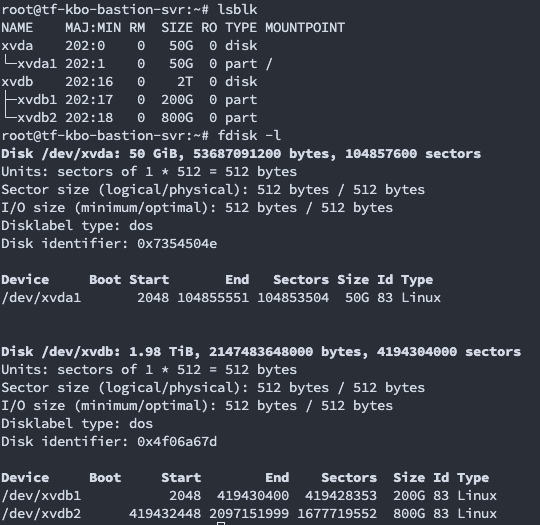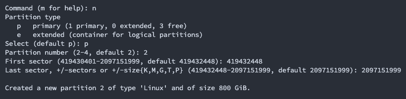 fdisk 명령어를 이용해 1TB 의 디스크를 200GB, 800GB로 파티셔닝을 진행합니다.