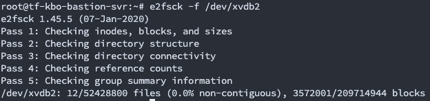 e2fsck 명령어로 해당 파티션의 파일시스템 크기를 확인할 수 있습니다.