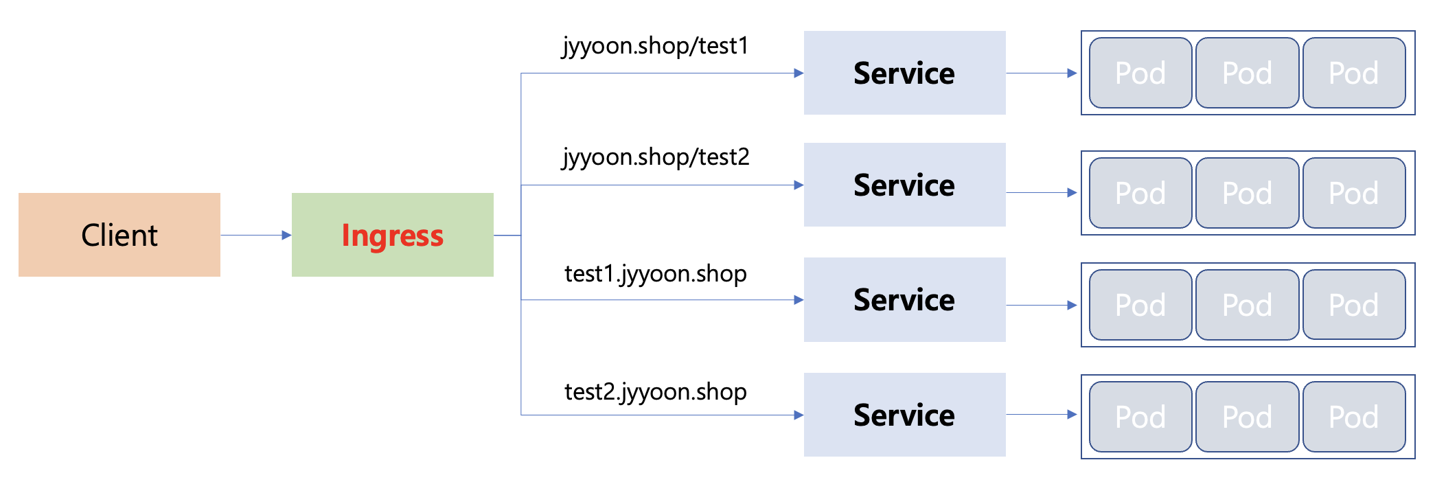 원본 : https://jyyoon94.tistory.com Cloud SA's This and That jyyoon94.tistory.com 쿠버네티스 클러스터 외부에서 서비스를 액세스하는 방법 중 단일 IP 주소로 여러 서비스를 노출하는 인그레스 리소스를 사용하는 방법을 통해 서비스를 노출하여 접속해보는 테스트를 진행해보았다. 우선 간단히 인그레스에 대해 설명하자면! 로드밸런서 서비스는 각 서비스마다 자신의 공인 IP 주소를 가진 로드밸런서가 필요하지만 인그레스는 하나의 IP 주소로 수십 개의 서비스에 접근 가능하도록 지원해준다. 클라이언트가 HTTP 요청을 보낼 때 요청한 호스트(host)와 경로(path)에 따라 요청을 전달한 서비스가 결정된다. > 인그레스는 네트워크 스택의 어플리케이션 계층(H..